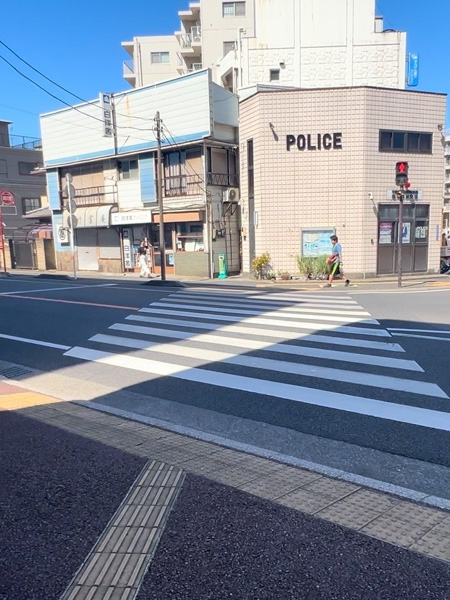 4さらに進むと交番が出てきます。ここで横断歩道を渡り左に曲がります。