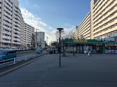2駅を出ると、右手に『スーパーあまいけ』が見えます。そのまま正面の大きい道路沿いをお進みください。