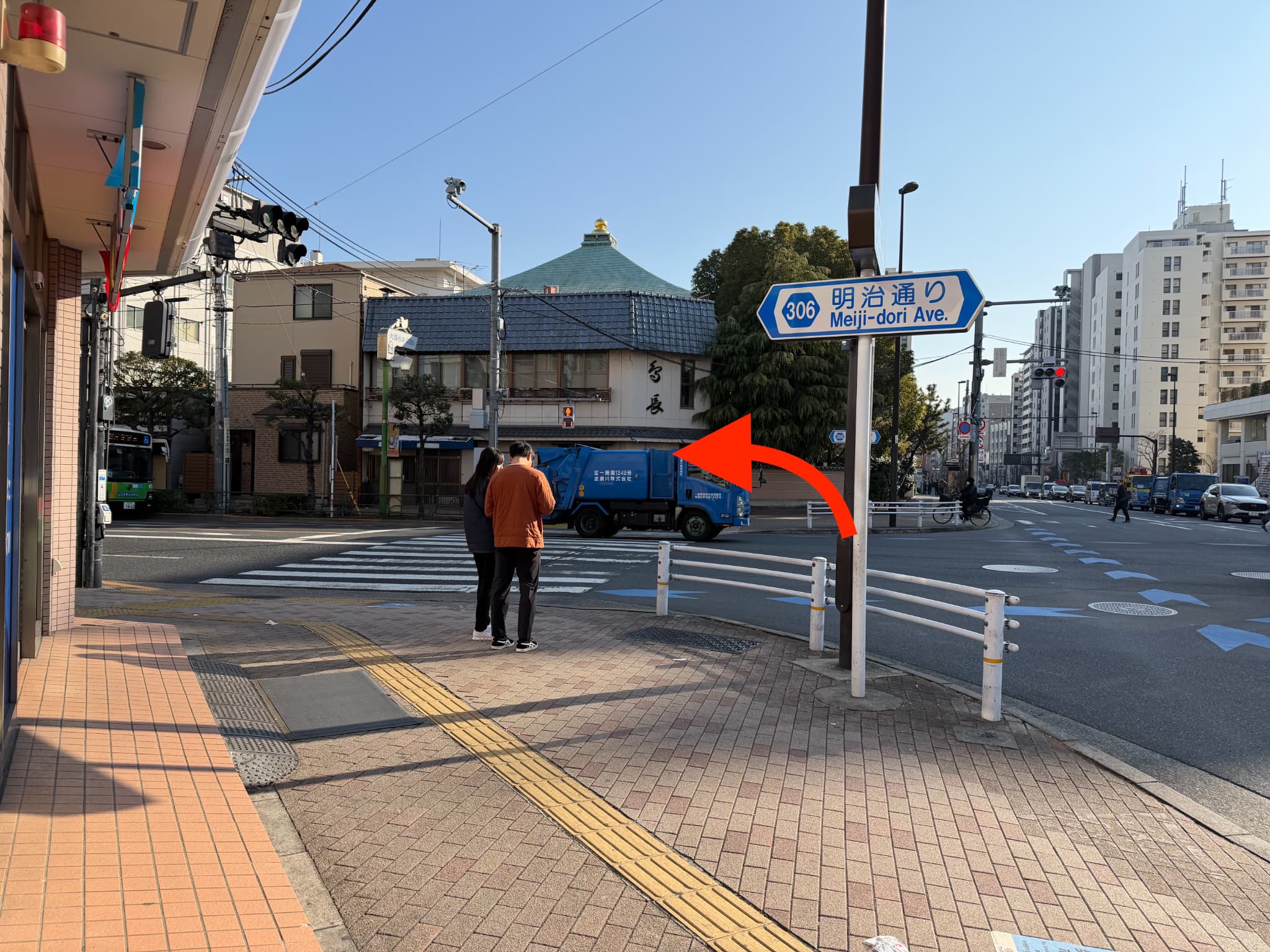 階段を降りたら明治通りを左手に500-600m直進します。