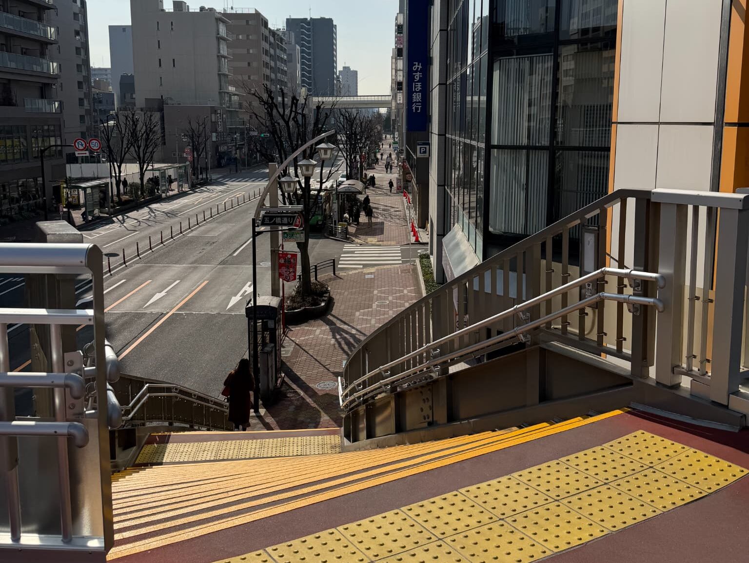 みずほ銀行の看板がある階段を下ります。