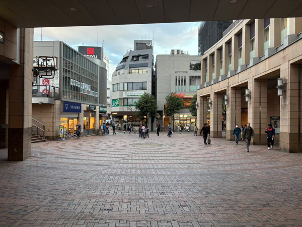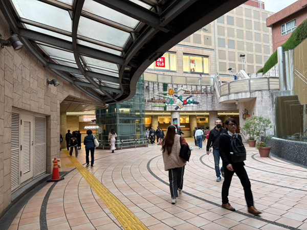 5ひらけた広場に出ましたら、左奥へお進みください。※階段がご心配な方は中央のエレベーターをご利用ください。 エレベーターをご利用の方はエレベーターを出た正面の大きな通りを右にお進み頂くと、(8)から同様の道のりです。