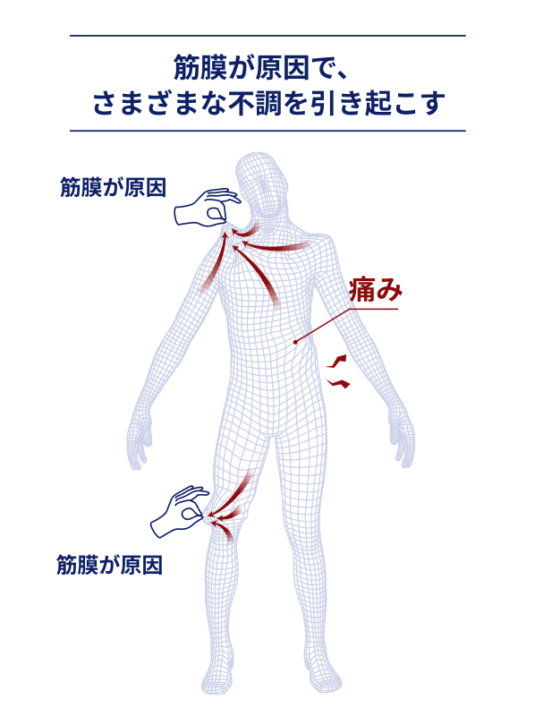 近年の研究により、この筋膜の異常や癒着が痛みや不調の原因となることが明らかになってきました。