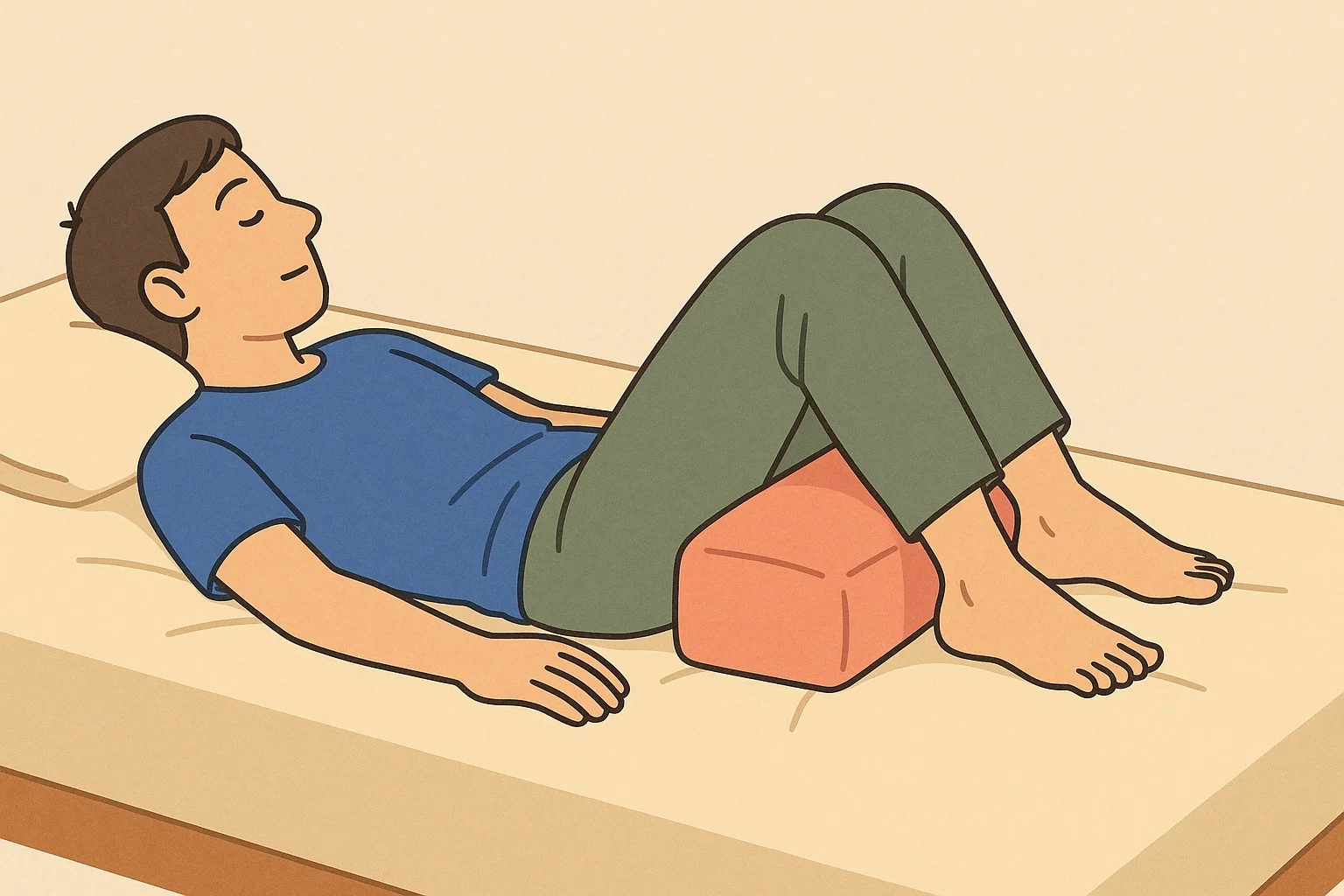 ぎっくり腰を起こしているときに、通常通り脚を伸ばした状態で仰向けになると、骨盤が脚に引っ張られて痛みを感じやすくなります。また、うつ伏せになると腰が反って負担がかかるので注意しましょう。