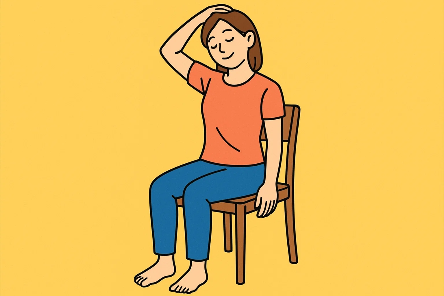 2.右手で左の側頭部(こめかみあたり)を持ち、頭を右斜め前にゆっくり倒す(そのまま15~30秒キープ)