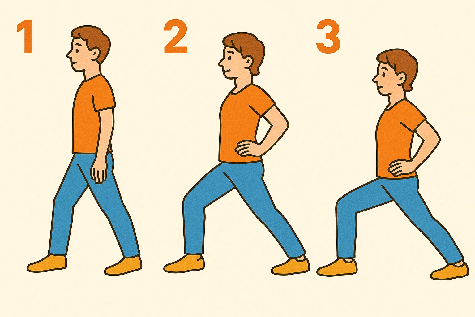 1.まっすぐに立って左足を前に出し、右脚を後ろに下げて足を軽く開く