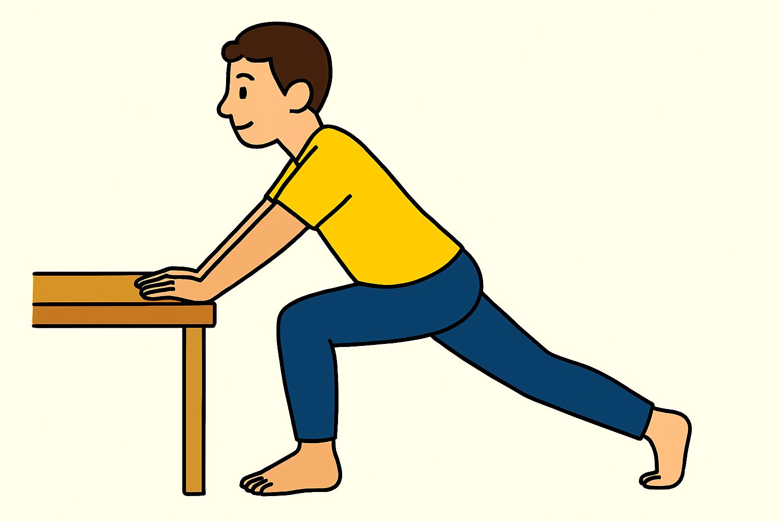 2.机に両手を当て、右足を大きく後ろに引いてかかとを浮かせる