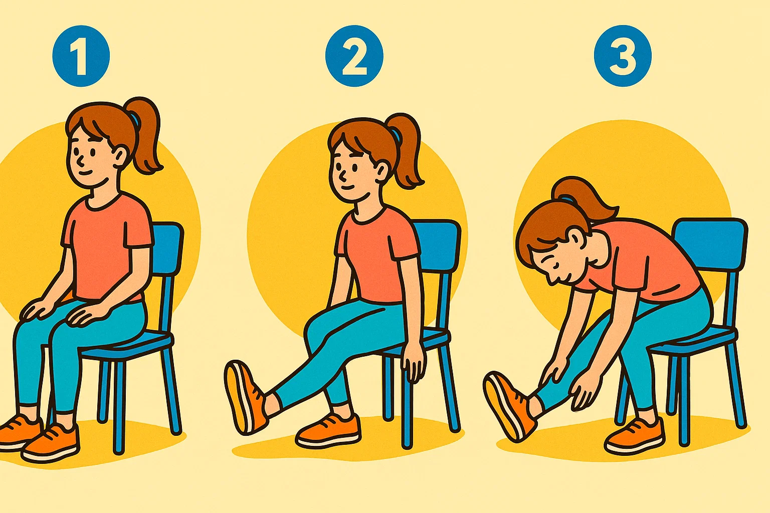 1.椅子に浅く座り、片足を真っすぐ前に伸ばしてつま先を天井に向ける