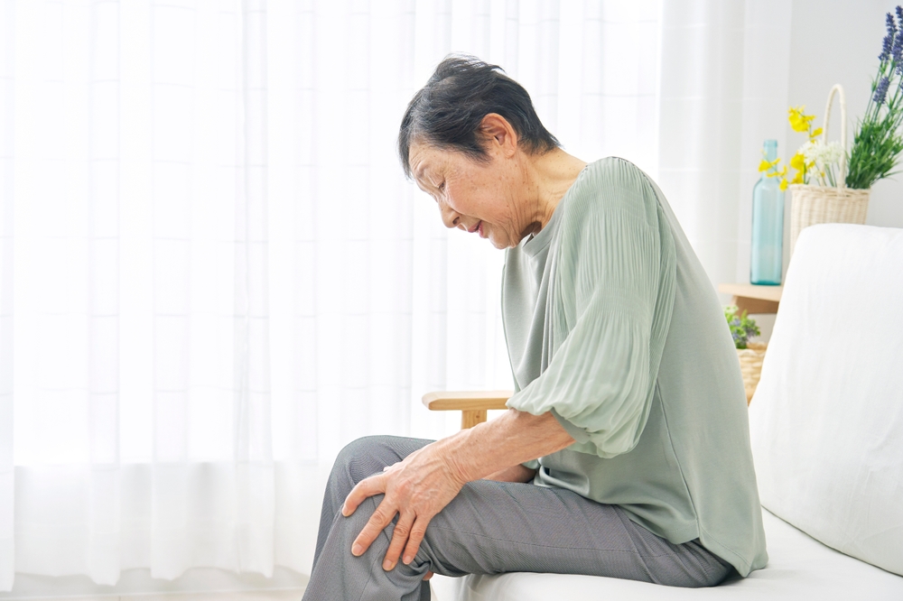 変形性膝関節症は、膝の軟骨がすり減って浮遊し、その軟骨の破片が滑膜に取り込まれて炎症が起きる疾患です。膝を伸ばしたときに痛むほか、階段の上り下りがきつい、膝周辺の組織に水が溜まる、「ミシミシ」「ゴリゴリ」といった音が聞こえるなど、さまざまな症状が現れます。