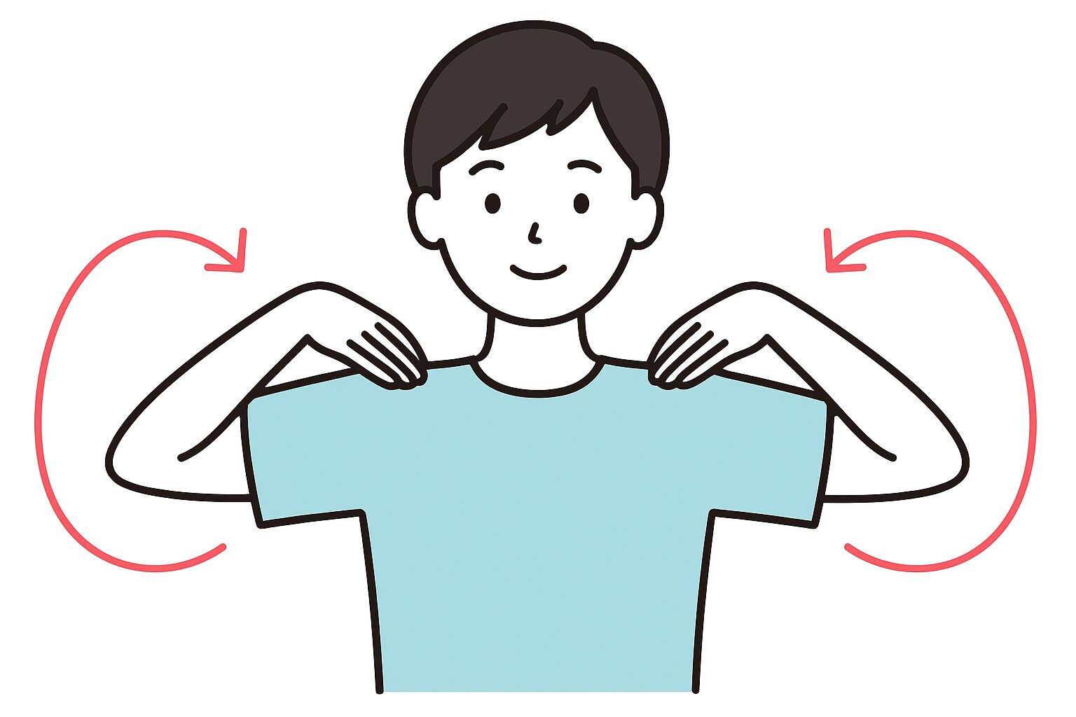 肩回しにより、肩こりの改善に加え、基礎代謝の向上や血行促進などの効果が期待できます。肩の上に両手を置いたら、肘を大きく回して円を描き、肩と肩甲骨が動いているか意識してみましょう。