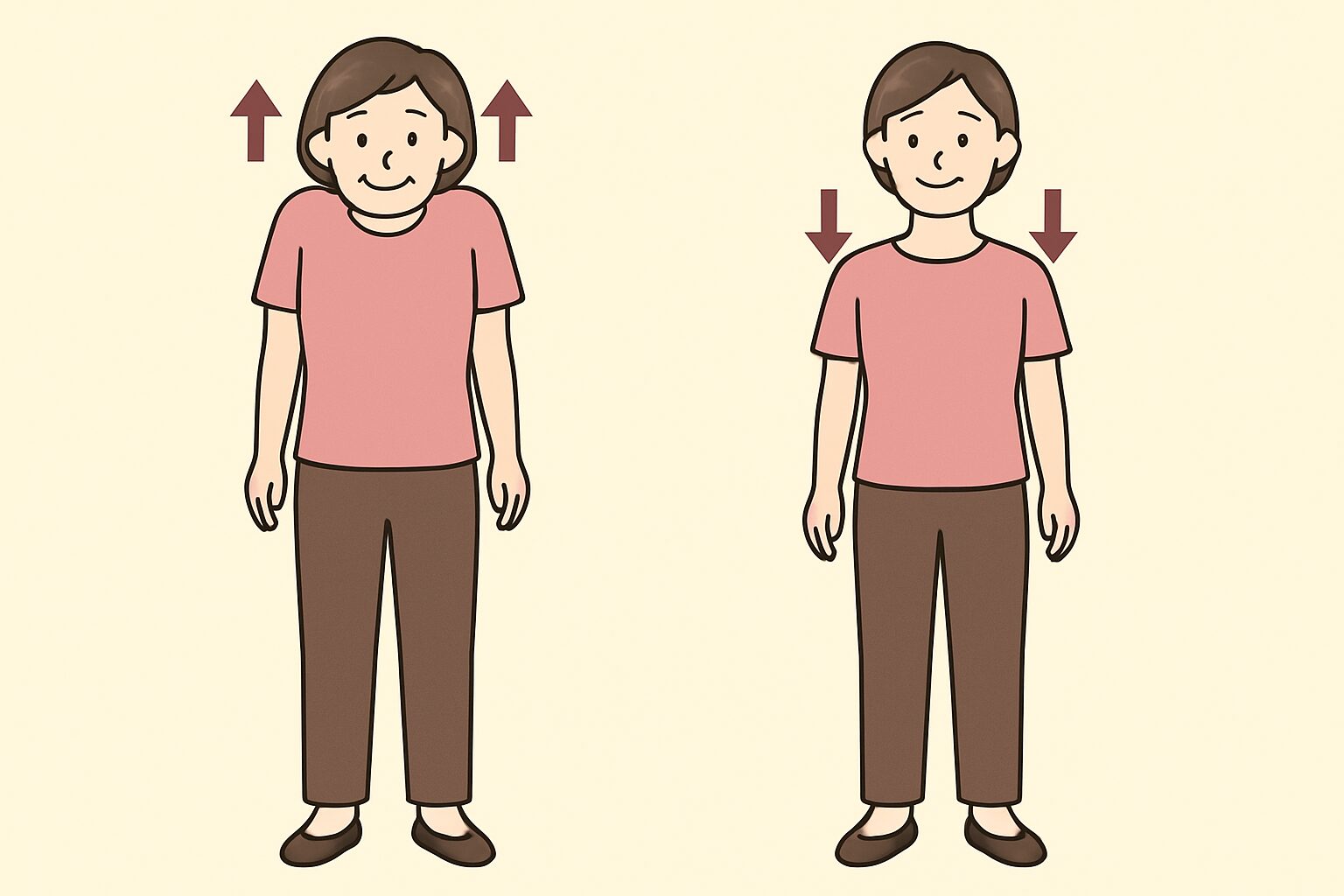 肩の上げ下ろし体操は、肩をすくめて両肩を耳に近づけるよう持ち上げ、3秒程度そのままの状態にして筋肉を収縮させましょう。このとき、肩が耳のやや後方に持ち上げるよう意識すると効果的です。3秒経ったら脱力して肩を下げ、5回ほどこの動作を繰り返しましょう。