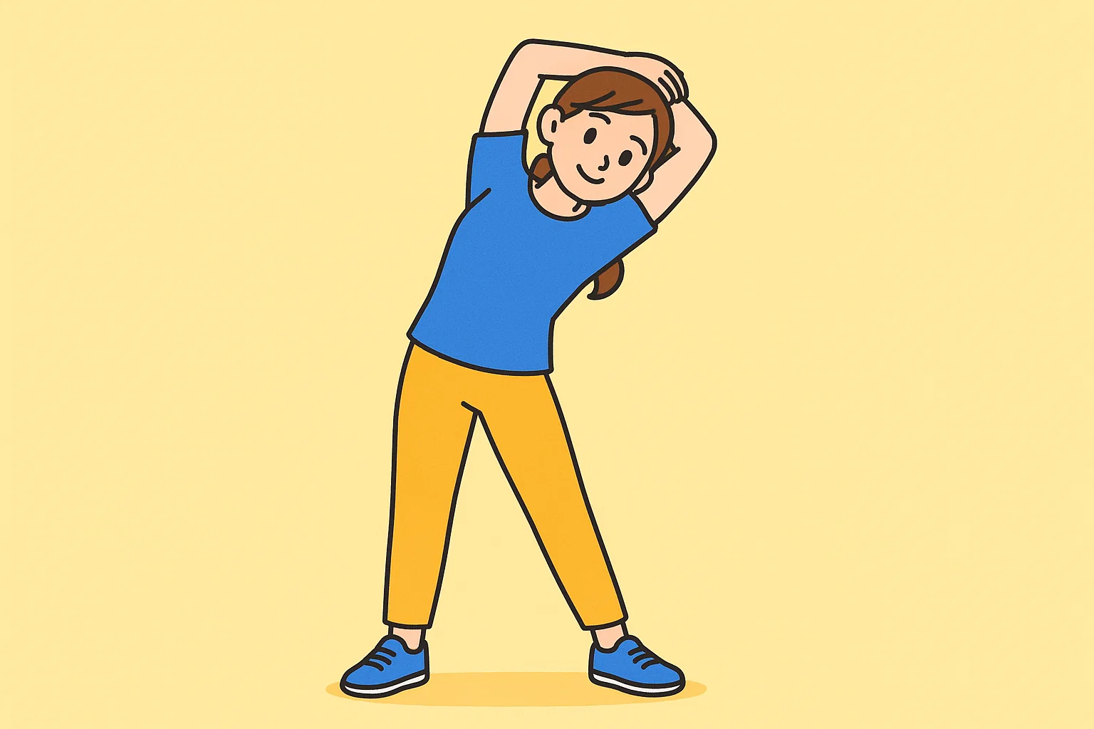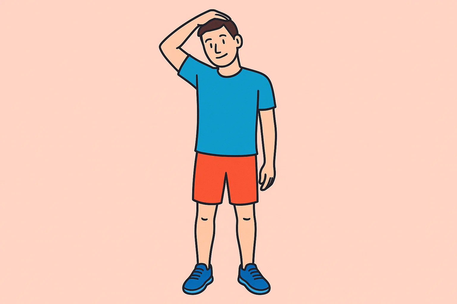 1.両手を高く上げ、両肘を曲げて右手で左肘を頭の後ろでつかむ