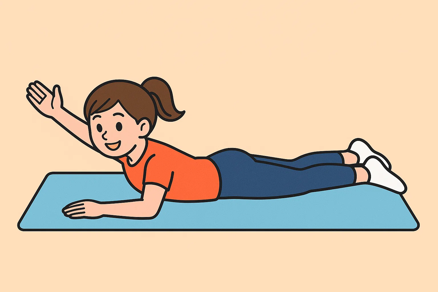 1.床にうつ伏せになり、片方の腕を肩の高さで前に伸ばす