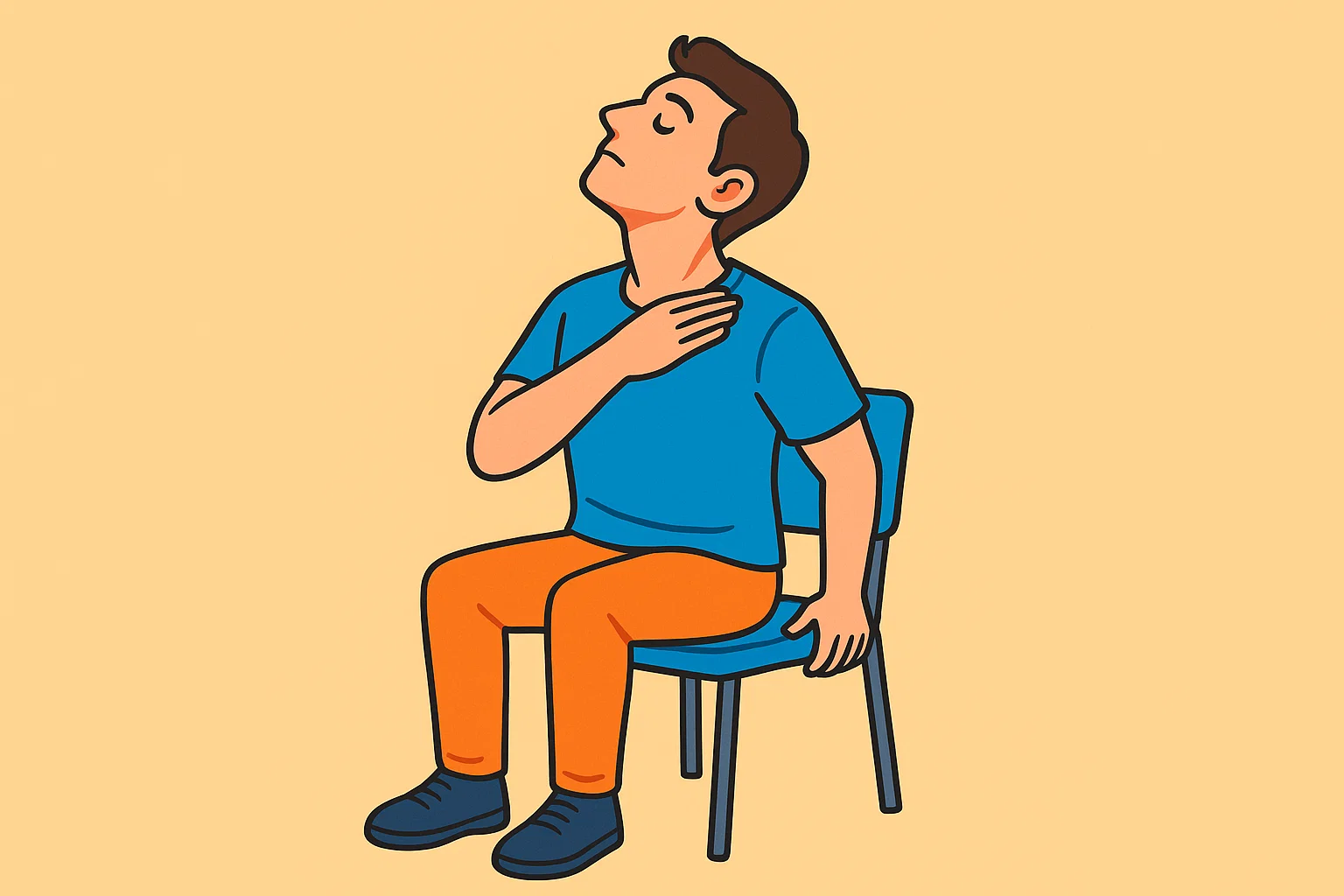 斜角筋(しゃかくきん)をほぐすストレッチです。斜角筋は、首の側面にある筋肉で、首を横に倒したり、呼吸をサポートしたりする働きがあります。