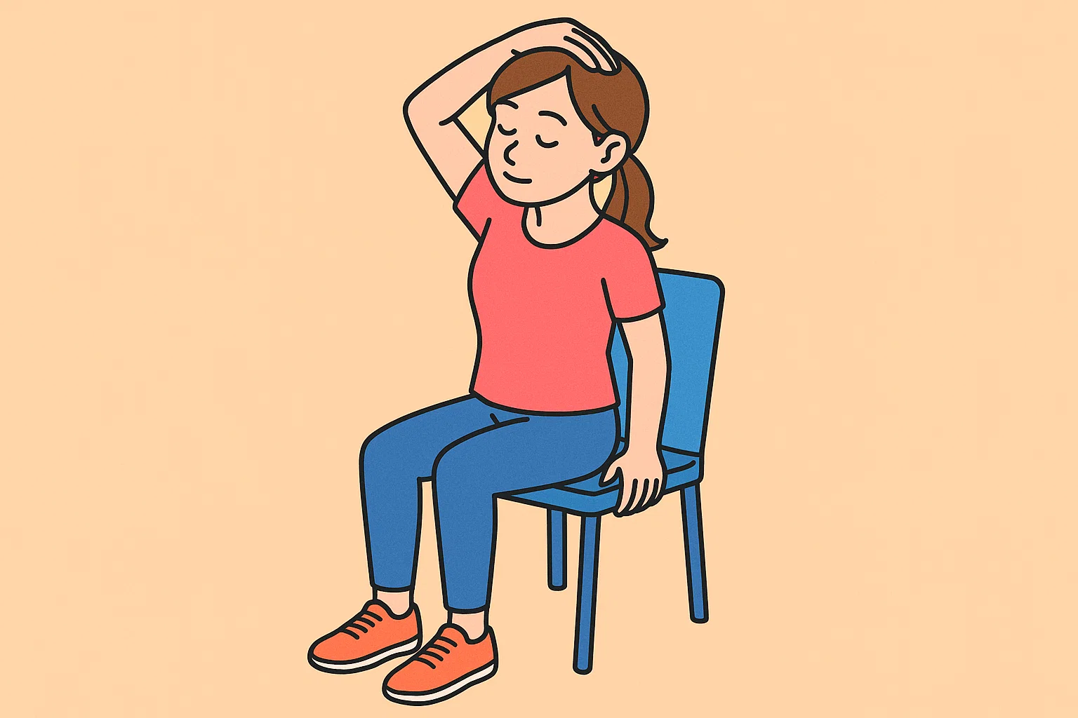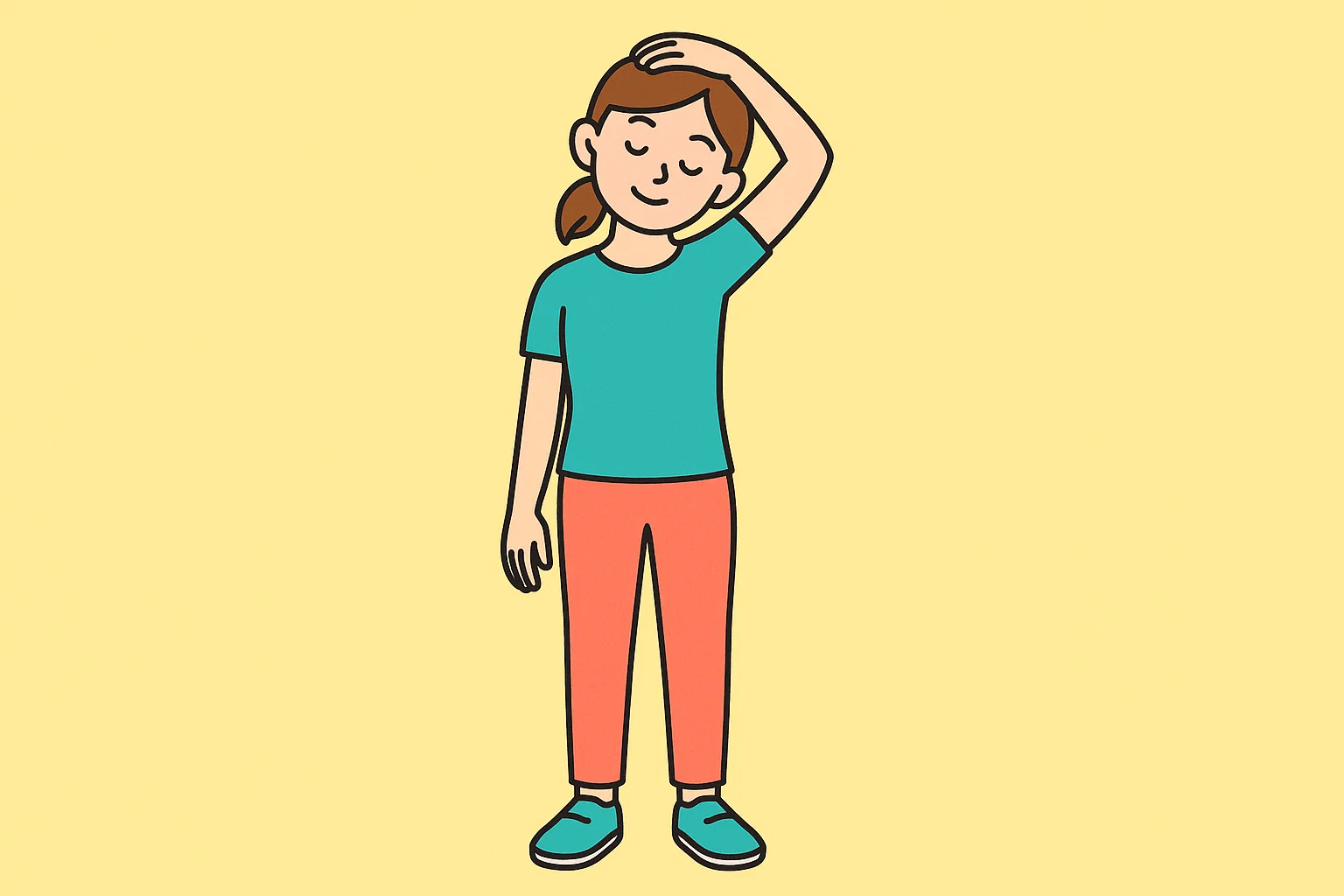 4.右手で首をゆっくり右斜め前に倒し、10秒キープ